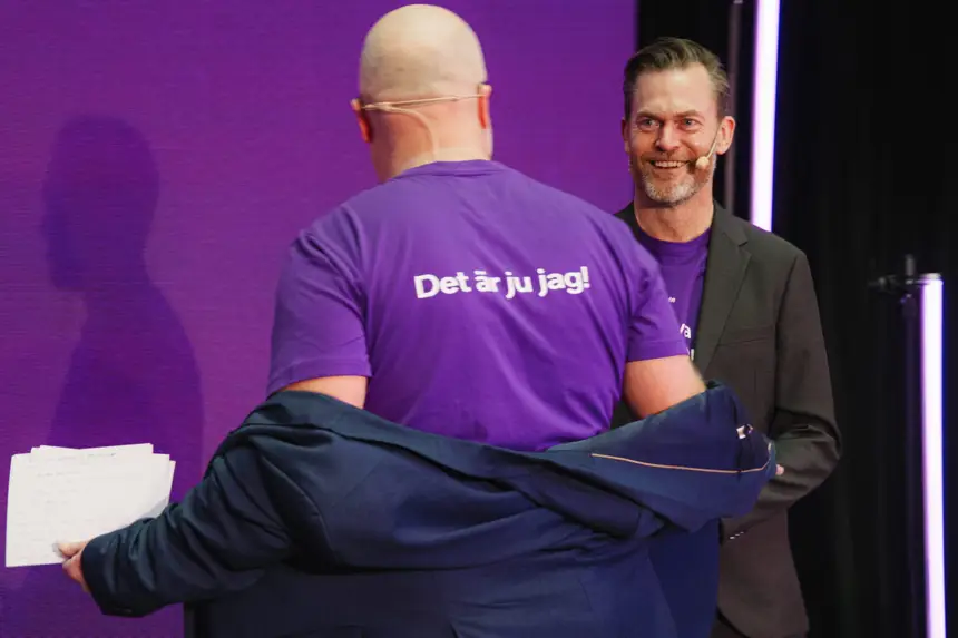 Anders Olsson som hälsar Välkommen hem till Telia och Telia Cygate.